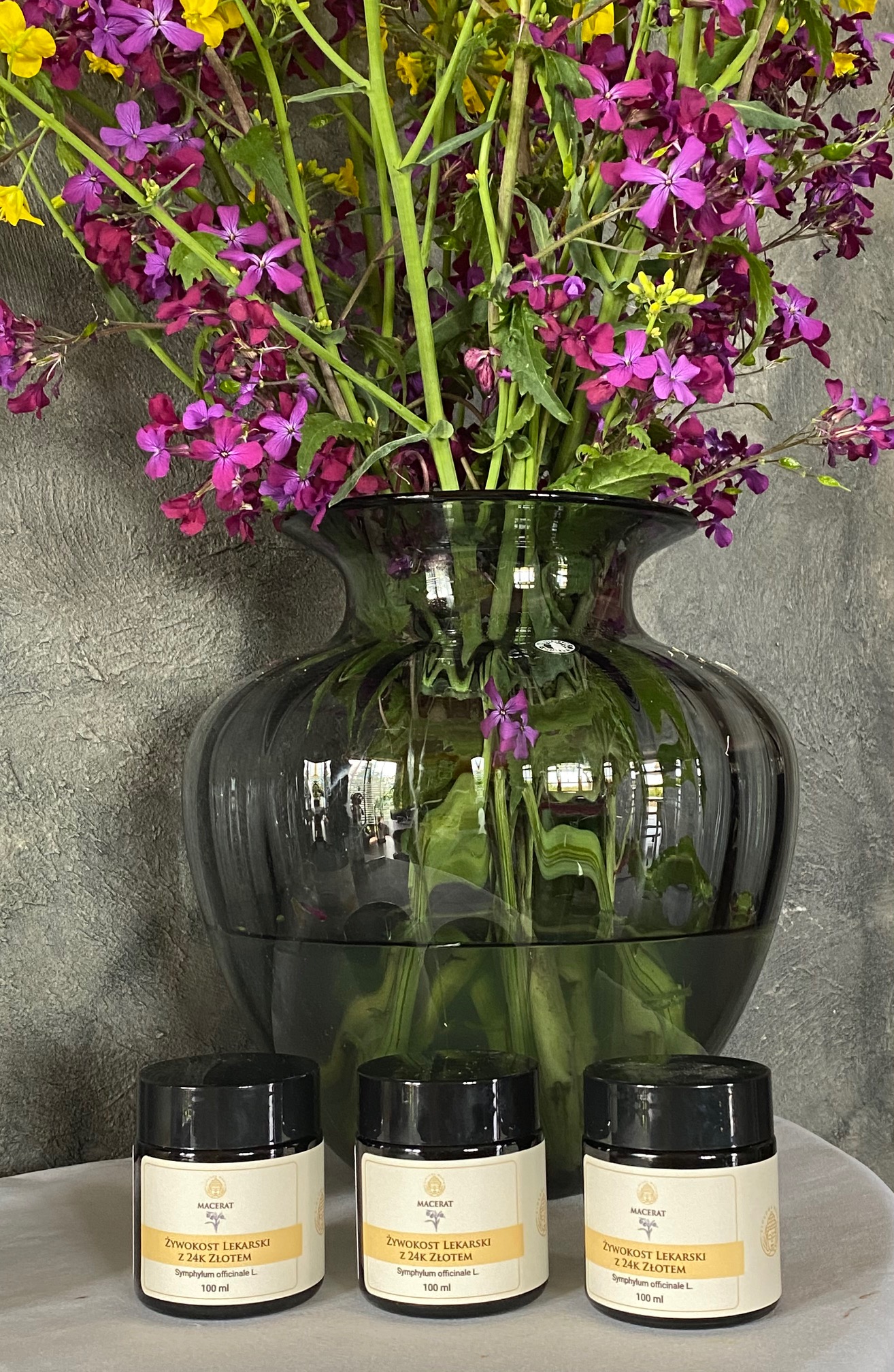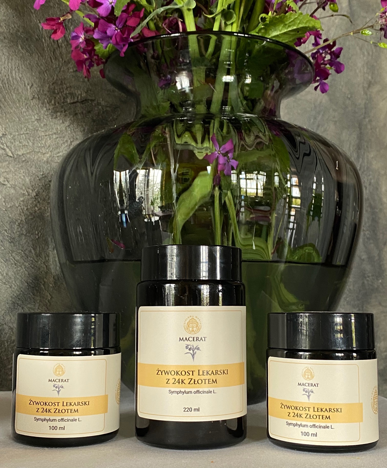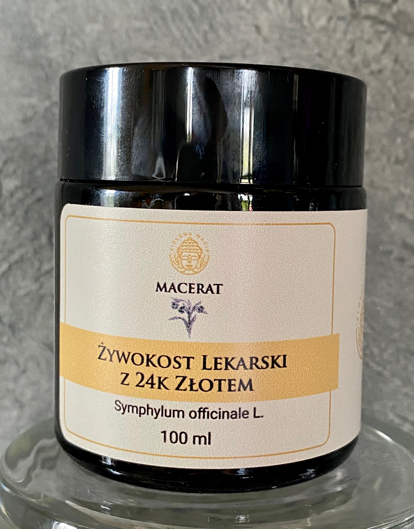 Skład maceratu: korzeń żywokostu lekarskiego macerowany dwukrotnie alkoholem oraz 24 karatowe złoto.